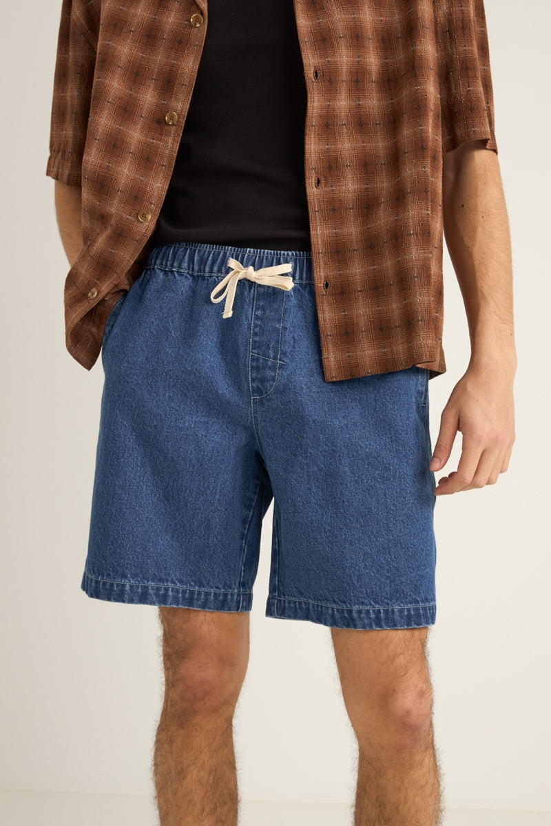 Exude timeless appeal with the Denim Jam in Stone. Crafted from 100% cotton denim, these shorts feature a 19-inch outseam, elastic waistband, and poly drawstring. With side seam hand pockets and a back patch pocket, ideal for casual beach days and creative endeavours, offering a vintage hand feel.----Material100% COTTON DENIM