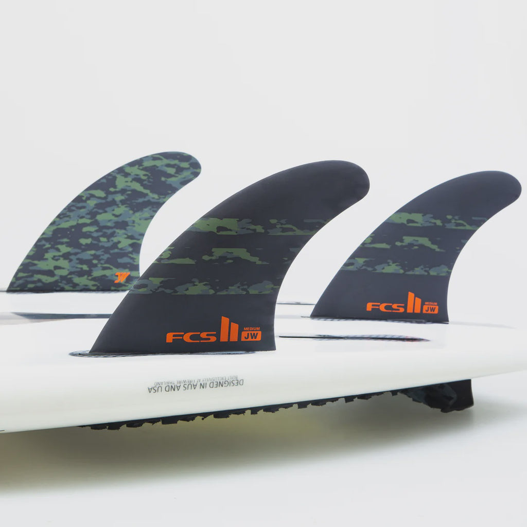 Julian's thruster set features a neutral side fin template with a smaller centre fin. This makes it ideal for performing short arc turns, and fast futuristic surfing on and above the lip.