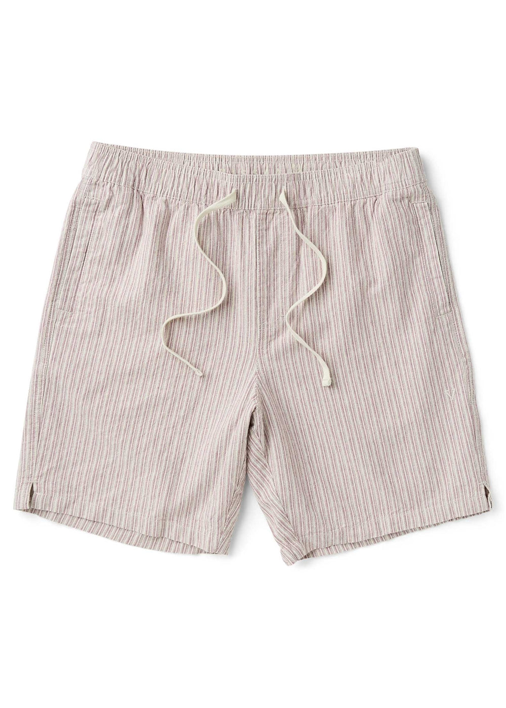 Linen fabric. Style features button down back pocket and on seam welt side pockets. Center front tethered waistband closure