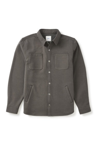 The Harold Fleece Shirt Jacket is made from soft poly-cotton fleece-backed twill fabric. It features front welt pockets, a snap front closure, and chest patch pockets.