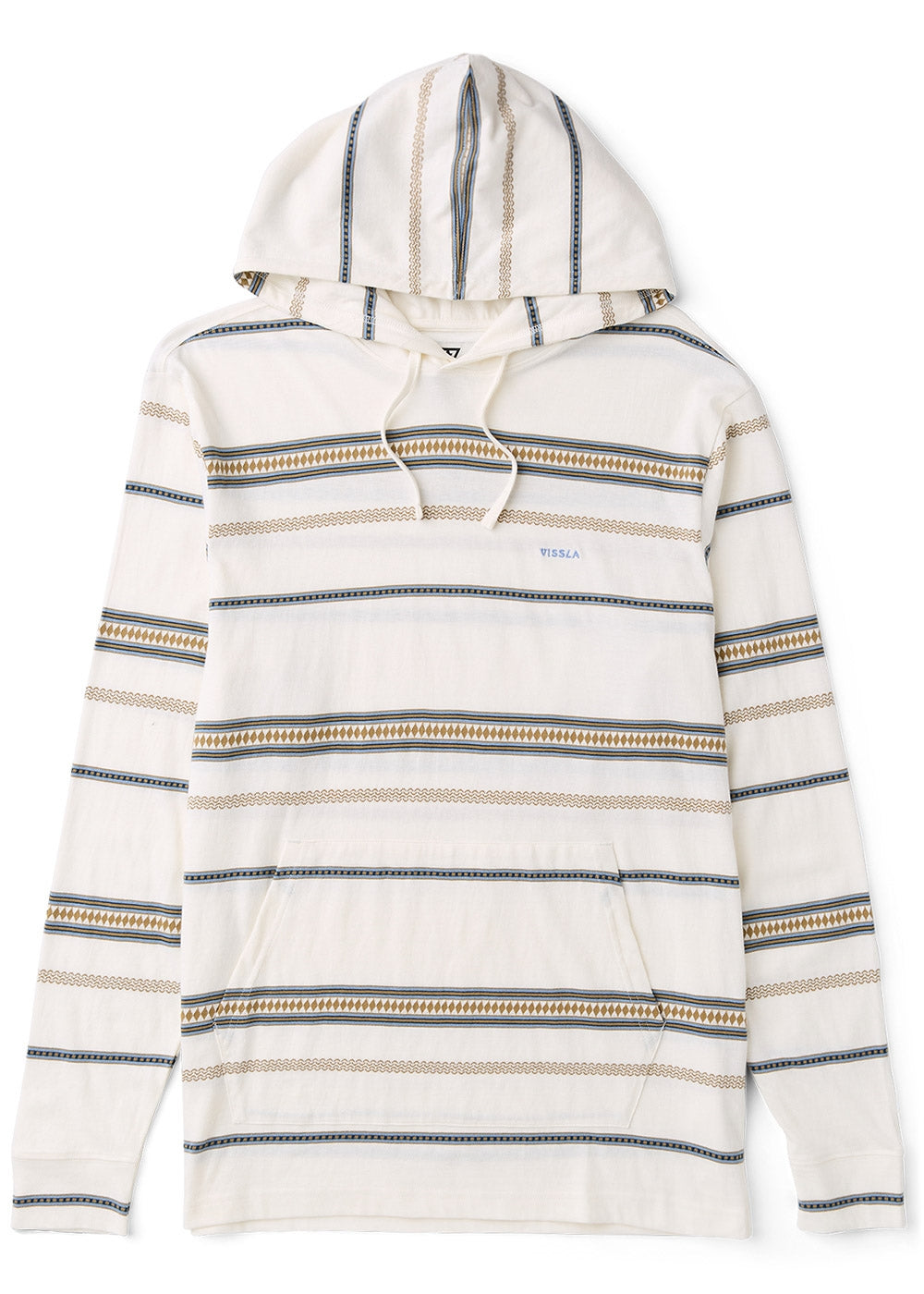 30 singles yarn dyed striped hooded pullover. Features a kangaroo hand pocket" side seam woven label and Vissla chest embroidery. Garment Soft Wash.