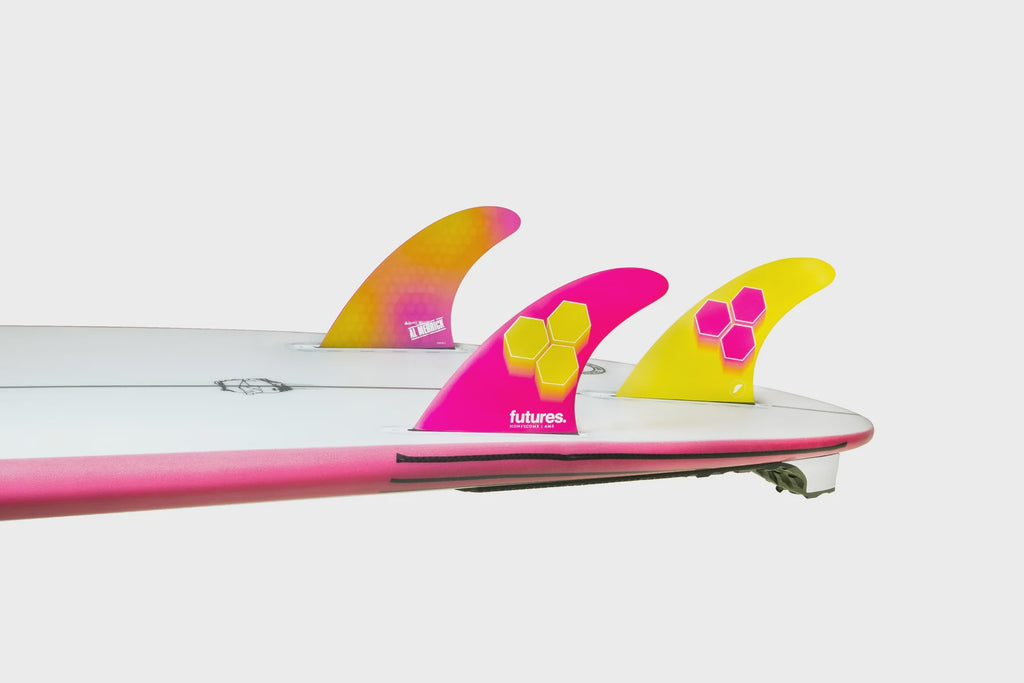 The AM3 Honeycomb designed by legendary shaper Al Merrick of Channel Islands Surfboards, is a small size thruster in the Rake template category. Intended for lightweight surfers to perform in all conditions, the honeycomb construction offers a balanced flex pattern. The template's extended rake is ideal for powerful carves and the thin tip provides for optimal release off of the top.