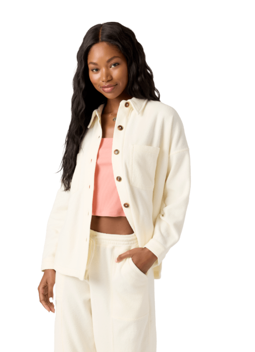 Knit Long Sleeve Shacket80% Cotton, 20% Polyester Terry27'' HPS LengthRelaxed Fit, Front Pockets, Faux Horn Button Front and Cuffs, Saddle Hem