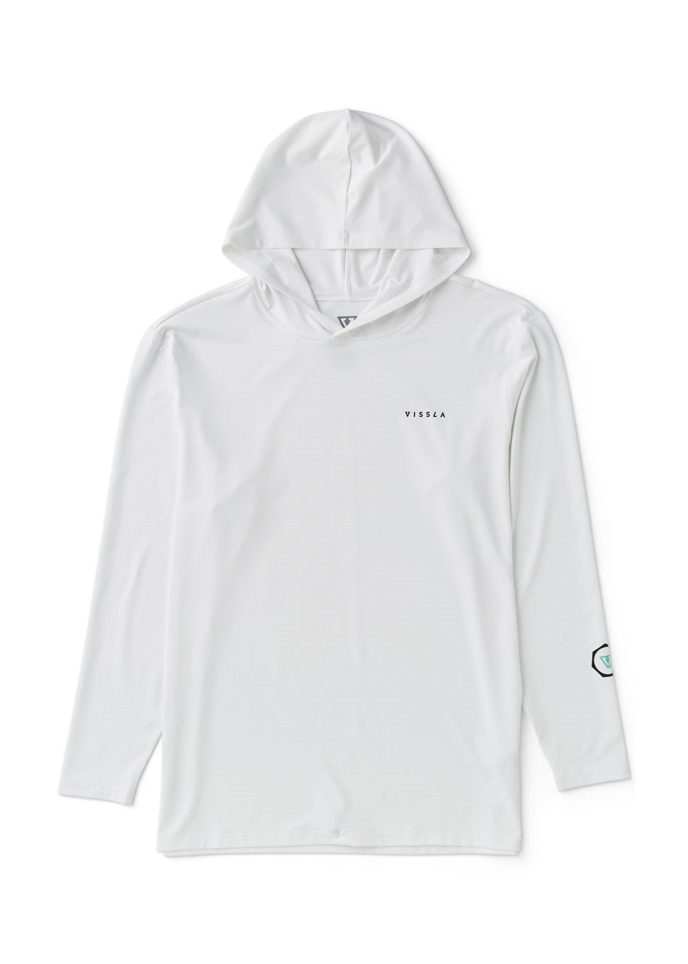 Wet or Dry UPF 50+ Hooded long sleeve. You"ll be fully covered when the sun gets ruthless" but you still want to stay in the water. "Soft" cool" comfort and made sustainably." "This is the ideal 5oz heathered surf tee with screen print logo at front chest. Features elastic loop at front bottom hem. Made from 80% Recycled Poly 20% Spandex."Fast dry" Antimicrobial" Moisture Wicking" UVA/UVB protection 50+" 85% RECYCLED POLY 15% SPANDEX